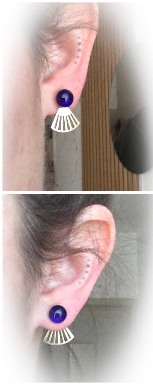 Draagwijze: Er zijn 3 manieren om deze oorbellen te dragen. Het messing ornament voor je oorlel, of achter je oorlel of enkel het glazen bolletje. Je kan ook indien je meerdere glazenbolletjes hebt afwisselen met andere ornamenten.