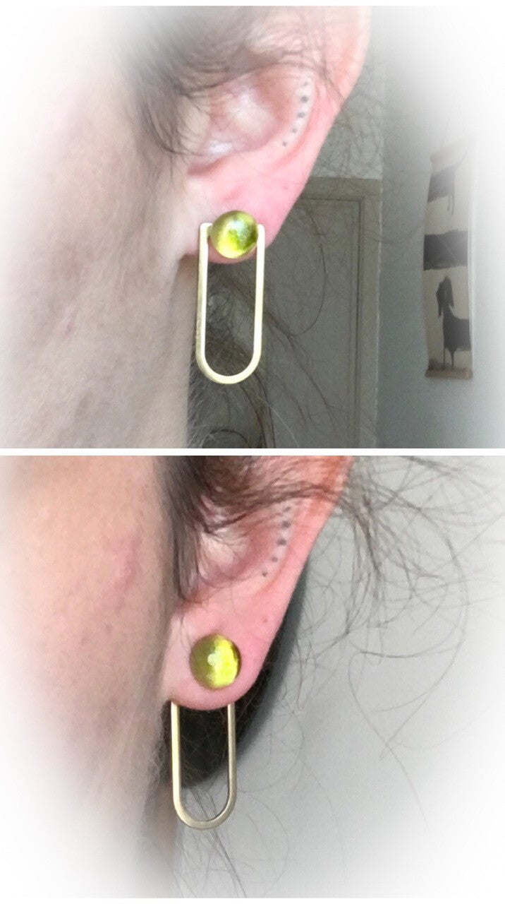 Draagwijze: Er zijn 3 manieren om deze oorbellen te dragen. Het messing ornament voor je oorlel, of achter je oorlel of enkel het glazen bolletje. Je kan ook indien je meerdere glazenbolletjes hebt afwisselen met andere ornamenten.