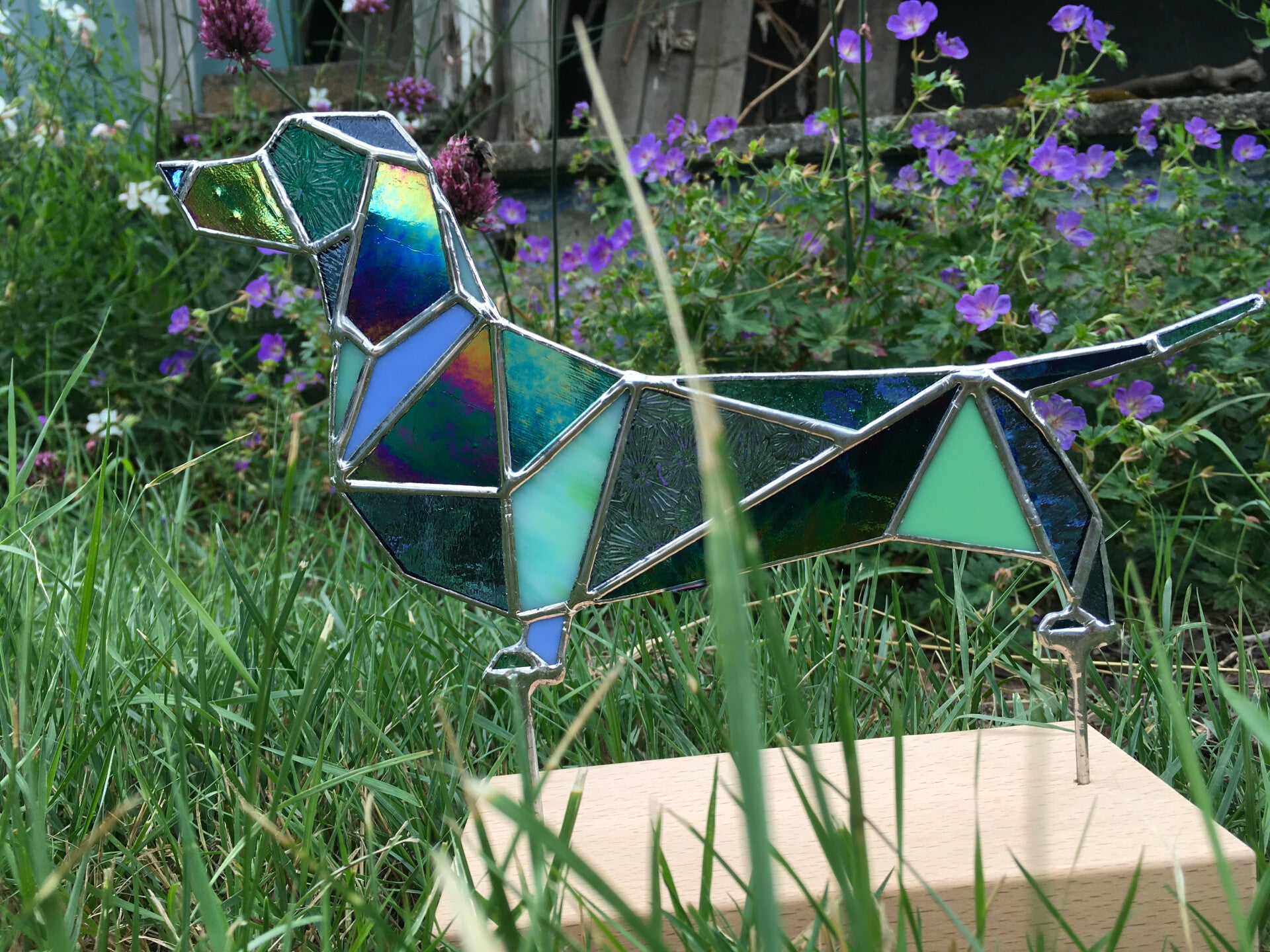 Teckel gemaakt dmv Tiffany techniek. Gemaakt uit restglas, in transparant en opaal glas.