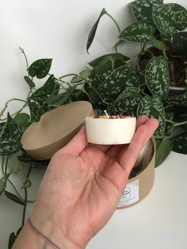Drie stuks, losse kaarsen die je in een schaal/potje kan zetten of op een mooi plateau. zonder geurstoffen, puur natuur, 100% soja was met gedroogde goudsbloem en rozen blaadjes.