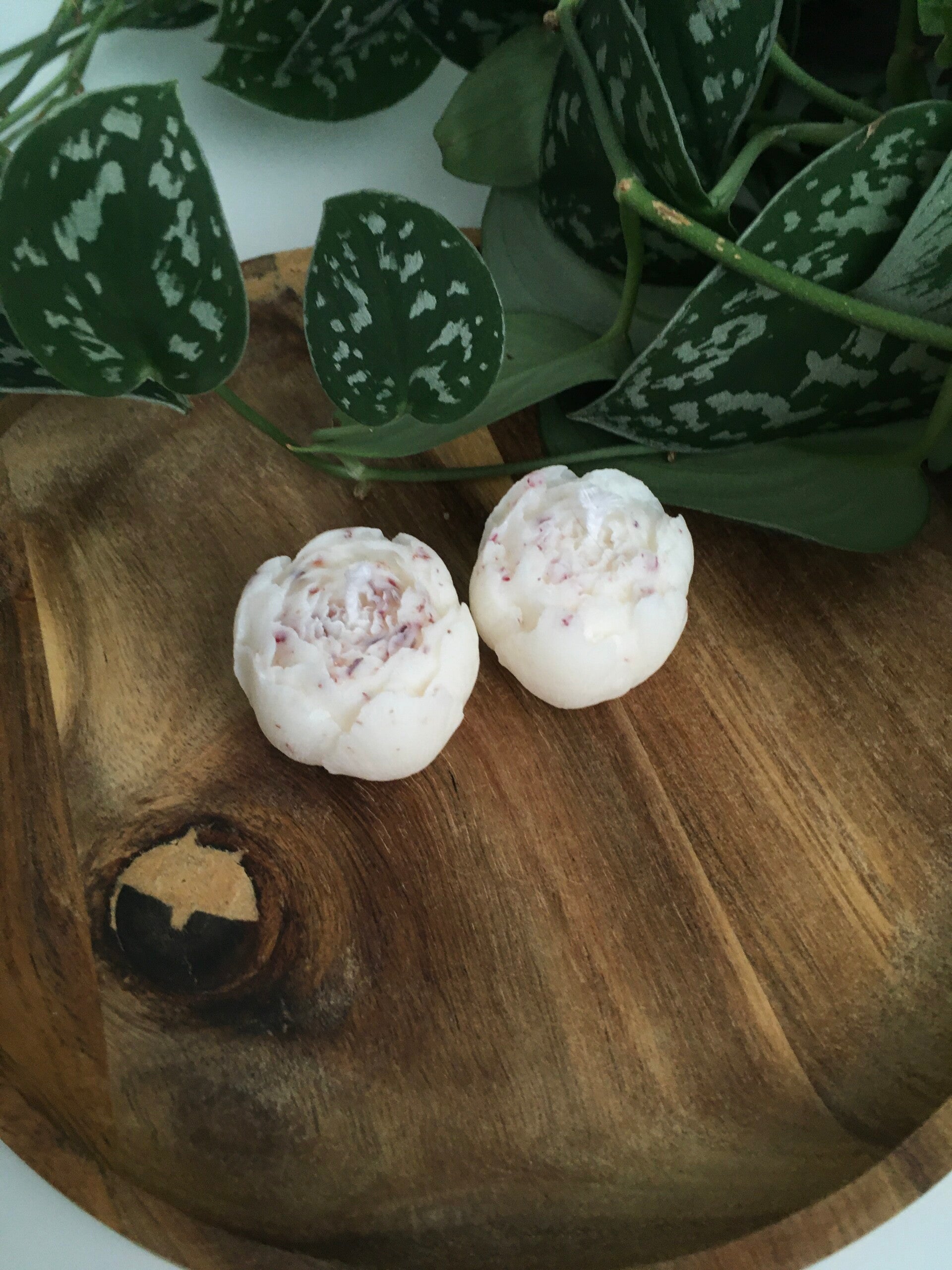Mini pioentjes, kaarsjes gemaakt uit 100% sojawas en gedroogde pioenblaadjes.
