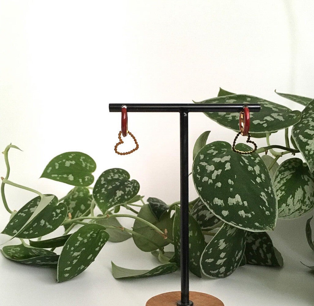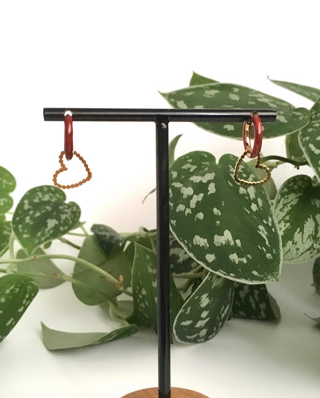 Diep rode oorringen uit RVS (roestvrij staal) met hartjes bedel.