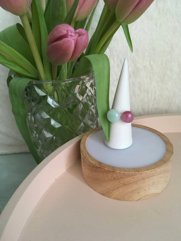 Sterling zilveren ring, handgesmeed. Afgewerkt met gesmolten glasbolletjes in mint en candy pink.