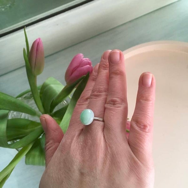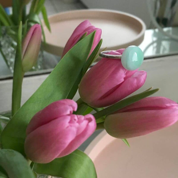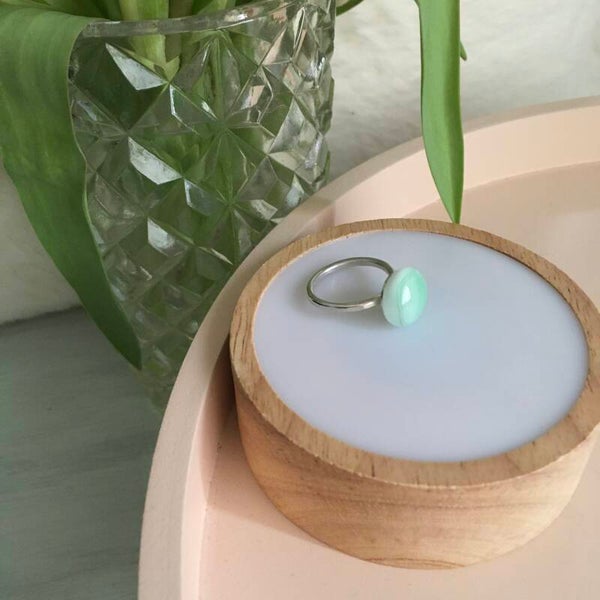 Sterling zilveren ring, handgesmeed. Met een gesmolten glasbolletje in mint green.