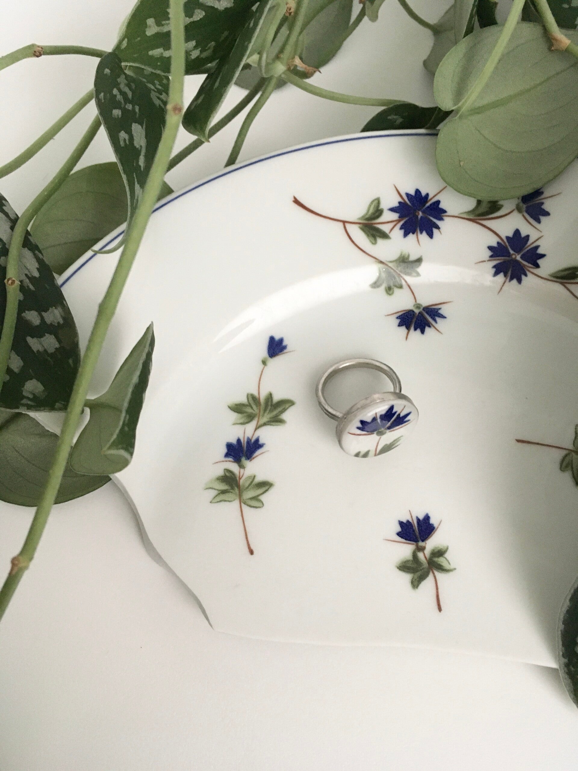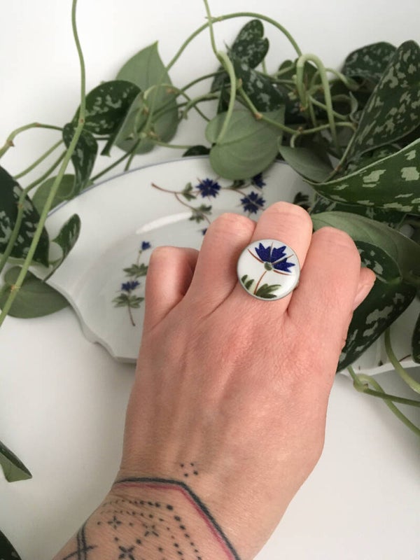 Sterling zilveren ring, handgesmeed. Met een korenbloem patroon uit vintage keramiek.