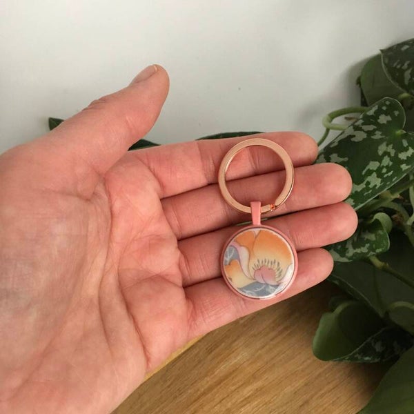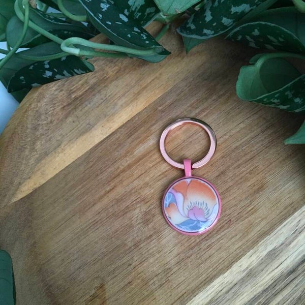 sleutelhanger gemaakt uit vintage keramiek. Oranje roze tinten.